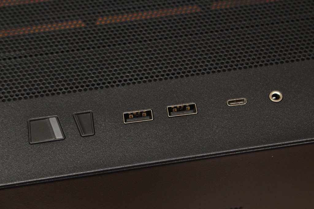 ▼下面是I/O配置,包括兩組USB3.0、USB3.2 Type-C、HD音頻輸入/輸出插孔、ARGB燈效切換與電源開關