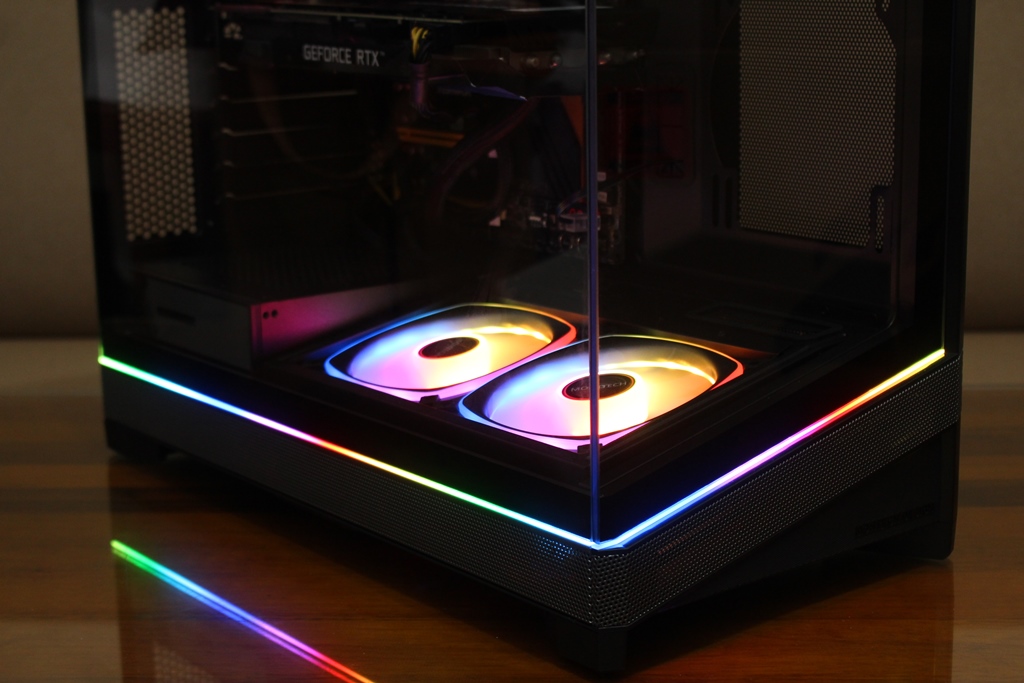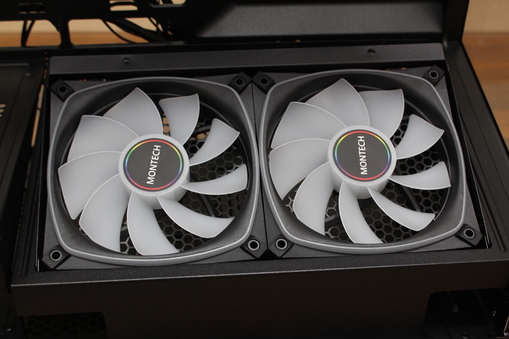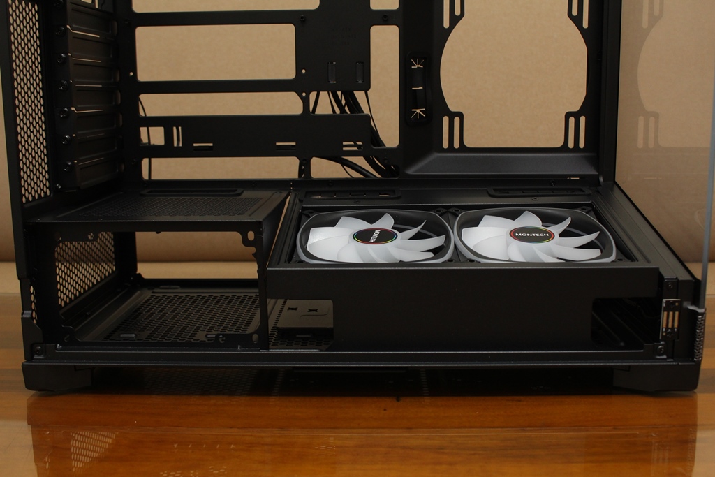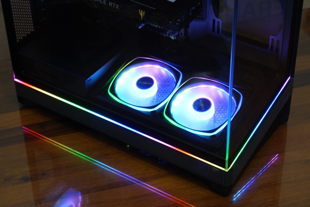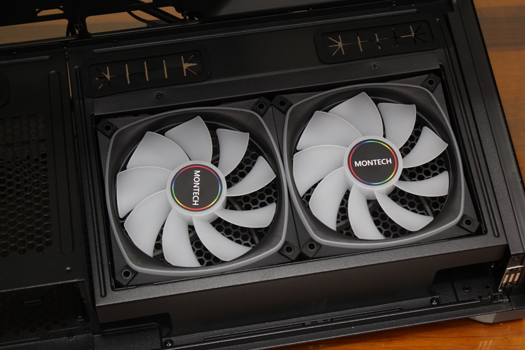 ▼底部可安裝兩顆120mm風扇,已內建兩顆RX120 PRO ARGB風扇,風扇支架是13度非平面設計