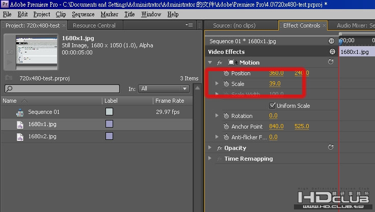 我開了一個720*480的project,把這幾個影片import進來,首先替所有影片片段做了各自的Sequence,這個階段我有點問題是他們都超過720*480的範圍,我知道可以手動縮放他們的尺寸,但是這個方式有點不理想,會在多個影片片段集合起來剪輯的時候出現誤差,有沒有哪個控制面板可以一個個調整?讓所有Sequence的影片片段都可以做出一樣的縮放結果?