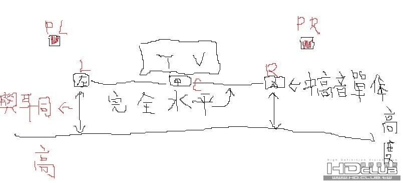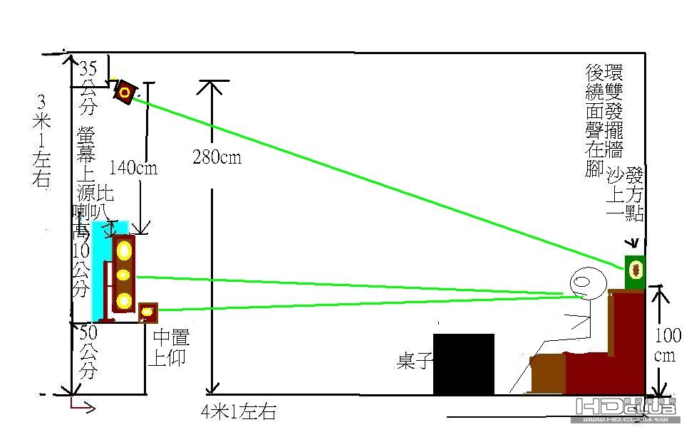 另外,您的上方音場小弟覺得吊太高了,應該像570大大所說的跟後環繞同高,說明書上也建議在180公分高度左右. |