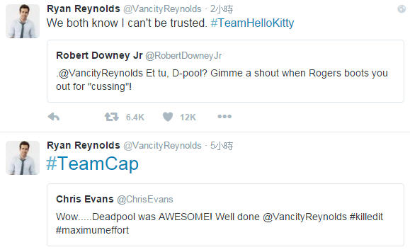 死侍、美國隊長、鋼鐵人社群上互相往來。美國隊長Chris Evans稱讚死侍好看必標記了死侍Ryan Reynolds,隨後Ryan Reynolds也給與了選邊站的標記TeamCap ,